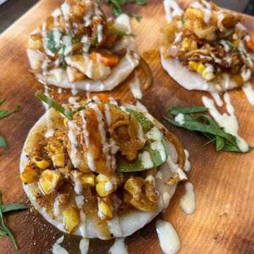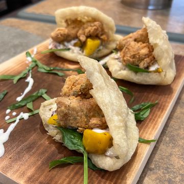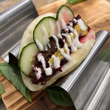 Three steamed baos filled with slow-braised oxtail, julienned pickled beets, thinly sliced cucumber & Chef Ling's signature pepper sauce.