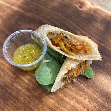 Crisp, golden spring rolls encasing succulent jerk-spiced chicken with julienned, pickled carrots and onions.