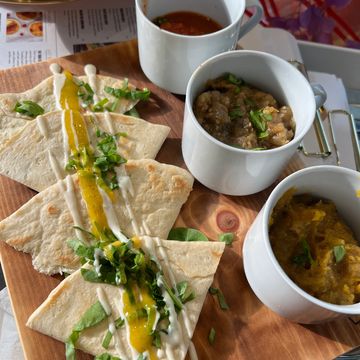 A taste of Trinidad, featuring four fluffy sada rotis paired with smoky chokkas of roasted pumpkin, tomato, and eggplant