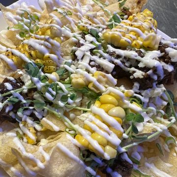 Crispy wonton chips topped with cheese, jalapeños, scallions, slow-braised oxtail & a sweet chilli drizzle.