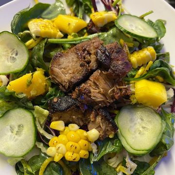 Crisp romaine, shredded cabbage, cucumber, chow mein noodles, char siu pork slices, fresh pineapple chunks, and sweet chili-tamarind vinaigrette.